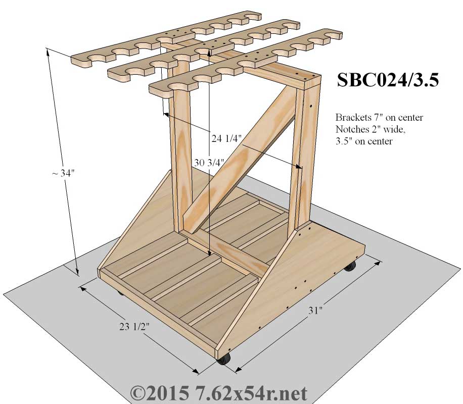 Freestanding Vertical Rack This semi-portable rack with swivel casters holds long guns vertically in a compact space and will fit through standard residential doorways. The frame is built of 1" x 3" yellow pine. The platform is 3/4" plywood and the caster wheels are 2" in diameter. It is available in 24 and 18 gun sizes with 3" and 3.5" spacing. To request prices on custom sizes please see the terms of sale. The 3" spacing works well for military bolt actions with straight bolts open, lever actions, shotguns and other narrow firearms. 3.5" spacing is more suitable for closed straight bolts and firearms with fixed charging handles. To the right is an SBC024 stained Dark Walnut. The Freestanding Vertical Rack ships disassembled. Click here for the SBC Assembly Instructions. "Received the racks (2 - SBC024/3.5) yesterday and I prefitted everything just to check out fit etc. Everything fit tight with smooth edges and no gaps. Today I stained the racks Dark Mahogany and it took the stain very nicely, I was prepared to do some finish sanding but found no need for that! I am amazed by the quality of these racks. Just wanted to let you know I appreciate quality, craftsmenship and a job done with obvious pride." - Ron N. Erie, PA "Racks (2 - SBC024/3.5) arrived today before the estimated date. All I can say is "WOW." I was impressed as soon as I opened the boxes. The packing was impressive. The quality of materials was top notch. The quality of workmanship and precision exceeded anything I have seen in woodworking. Everything was fantastic! They went together easily. Every hole was right on and countersunk. You definitely have a superior product in a class by itself. Thank you." - Jerry T. Marshall, IL |