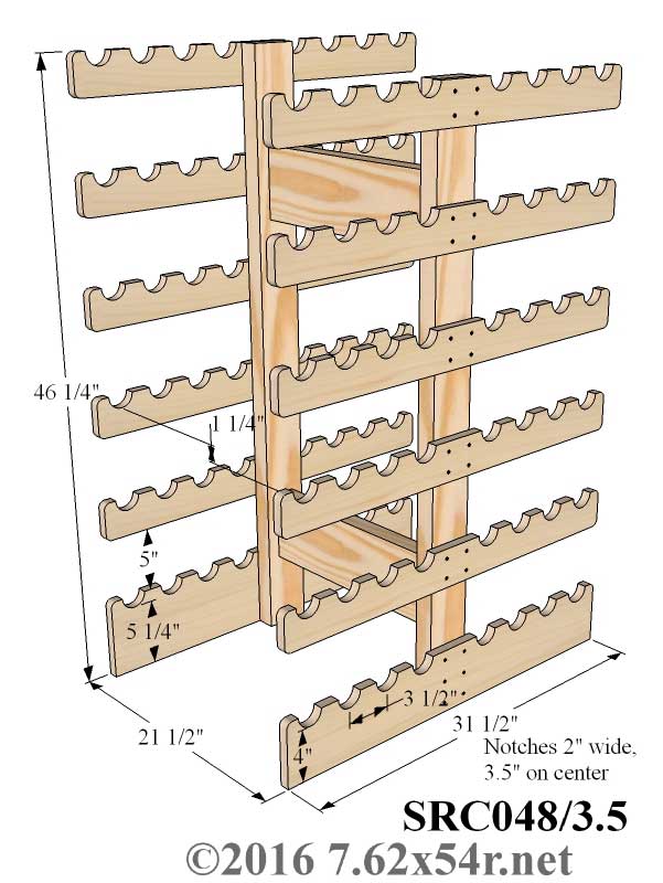 Stacked Table/Floor Rack This rack is based on a Finnish armory rack and holds multiple tiers of 8 rifles each in a space 28 1/2" wide with 3" notch spacing or 31 1/2" wide with 3.5" notch spacing.. The footprint depends on the length of the rifles in the rack. Each supporting board has eight 2" wide by 1" deep notches. The bottom brackets provide the lateral support. The rack is built with removable horizontal braces so that it can be broken down and stored or transported. The rack is very sturdy and can be loaded unevenly, although this is not recommended, especially with taller racks. The brackets are spaced 8" from bottom of notch to bottom of notch vertically. It is possible to remove the rifles from the end of the rack, but it is much easier from the side. Available with notches spaced 3" or 3.5" on center, the 3" spacing works well for military bolt actions with straight bolts open, lever actions, shotguns and other narrow firearms. 3.5" spacing is more suitable for closed straight bolts and firearms with fixed charging handles. "Shipment arrived today. (SRC048) Assembled everything and it went together fine. Looks beautiful. May stain it and put it in the living room. Nice packing job too. I expected a larger carton." - Harry Z. Manassas, VA |
