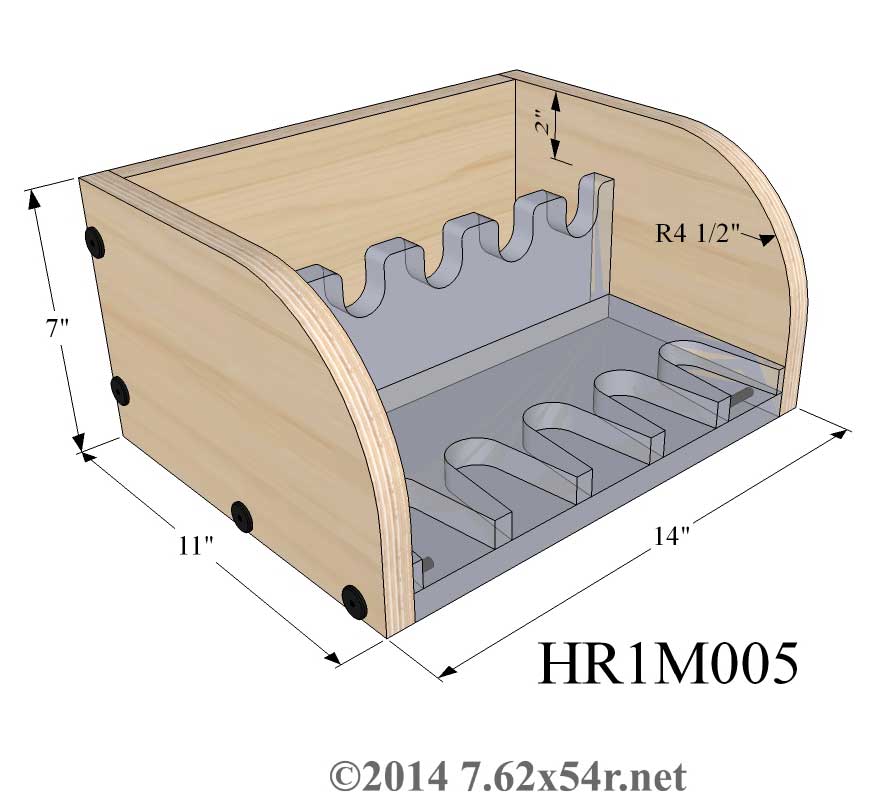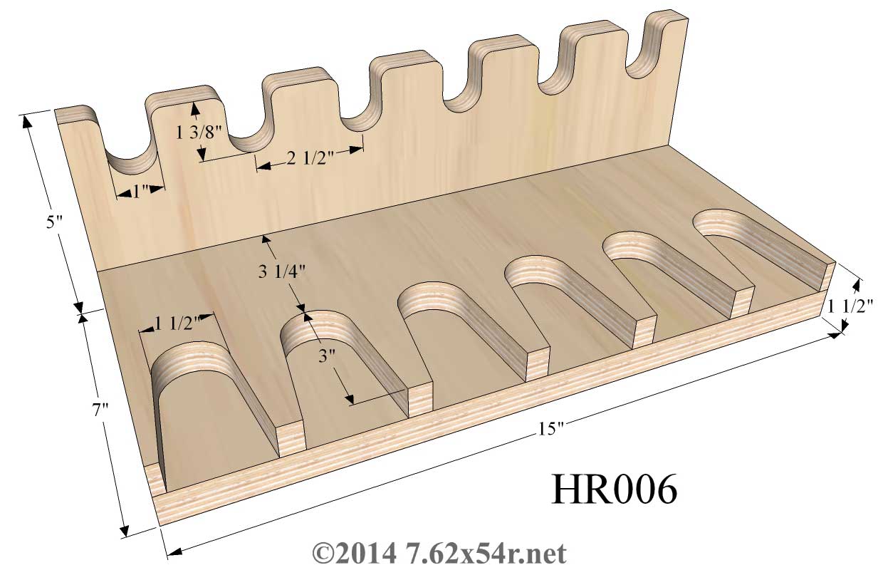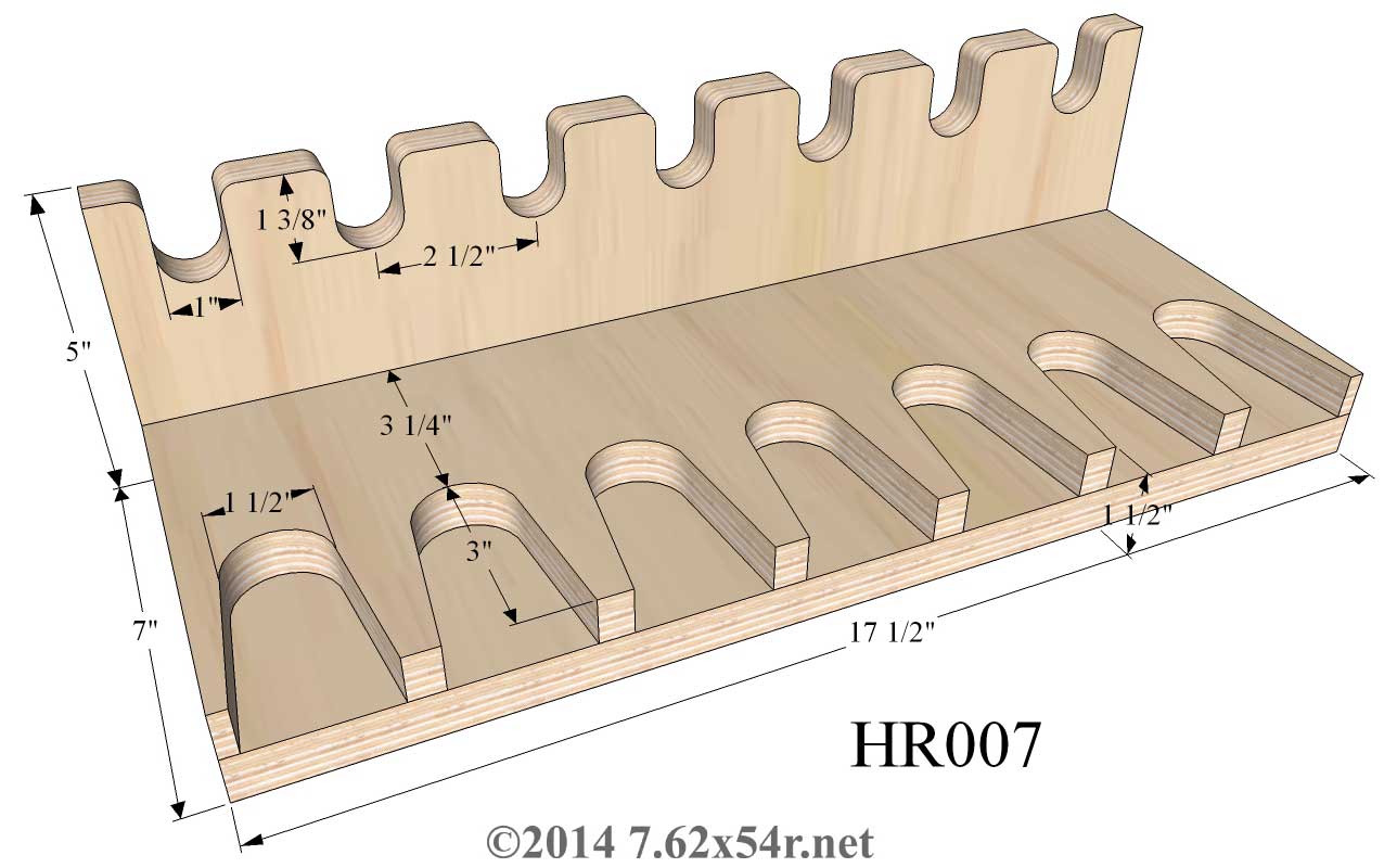 | 5 slot handgun rack, 1 1/4" wide barrel notch | HRW005 | 7" x 5" x 12.5" | $30.50 | $15.25 | 25", top only $1.50 (3') |